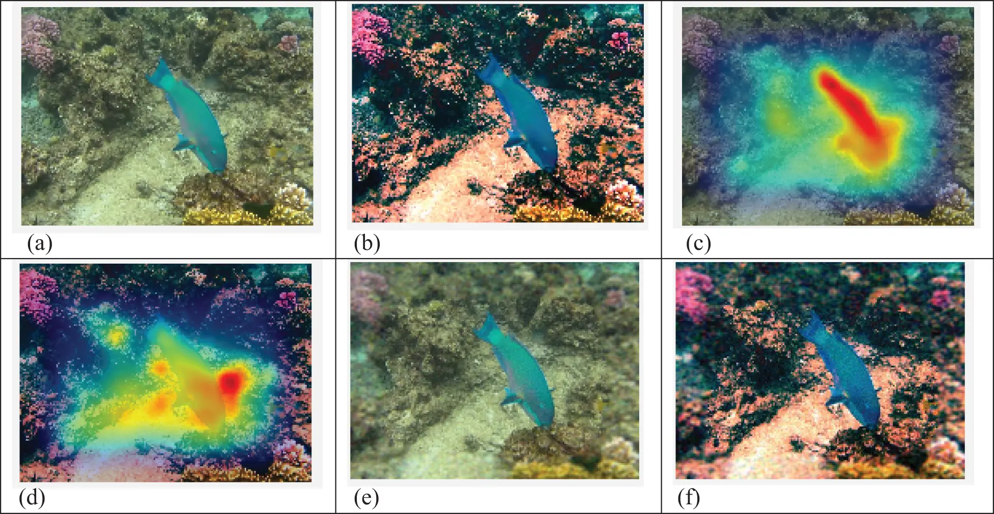 To test the algorithm, underwater marine images were taken. Fig. 4a represents an underwater image with a prominent blue light effect. Input image 4a is taken and a Saliency map is extracted as shown in 4c. A significant part of the ROI of the original underwater image is not given significant weights leading to a higher compression is adaptive shape methods in those areas where low compression levels should have been applied. Fig. 4e shows that higher compression levels were applied at even prominent ROIs, leading to a higher compression ratio and loss of ROI data during compression. To avoid this accurate saliency map extraction is important and the blue light effect must be removed. Underwater color image restoration was used to remove the blue/green light of the underwater marine images as shown in Figs. 4b–4d shows the saliency map of a restored color image from blue/green light effects and Fig. 4f shows the ELM-based shape adaptive DCT based compression. Same type of testing is applied for some more images and the results are shown in Figs. 5–9. The underwater color restored images have better PSNR and a lesser compression ratio to keep the quality of ROI significant.