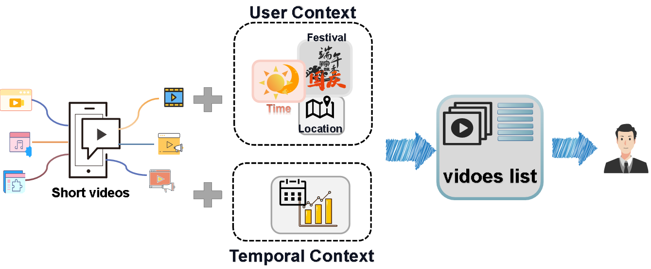 The concept of temporal contextual information has been incorporated into collaborative filtering recommendation algorithms, which made it capture more individuals’ attention [27–30]. Moreover, users may expect various recommendation results in divergent contexts [31–34]. In recommendation, take the user’s living habits as an example. Before going to bed, most users may prefer to watch a short video as sleep assistance. Similarly, we infer that users prefer to browse videos reflecting national pride during the national day. Therefore, incorporating the conception of user context into algorithm makes it reap huge fruits, so as to realize the diversity of recommendations.