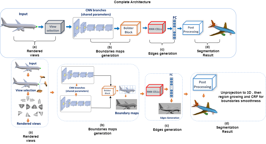 In the shape analysis community, decomposing a 3D shape into meaningful parts has become a topic of interest. 3D model segmentation is largely used in tasks such as shape deformation, shape partial matching, skeleton extraction, shape correspondence, shape annotation and texture mapping. Numerous approaches have attempted to provide better segmentation solutions; however, the majority of the previous techniques used handcrafted features, which are usually focused on a particular attribute of 3D objects and so are difficult to generalize. In this paper, we propose a three-stage approach for using Multi-view recurrent neural network to automatically segment a 3D shape into visually meaningful sub-meshes. The first stage involves normalizing and scaling a 3D model to fit within the unit sphere and rendering the object into different views. Contrasting viewpoints, on the other hand, might not have been associated, and a 3D region could correlate into totally distinct outcomes depending on the viewpoint. To address this, we ran each view through (shared weights) CNN and Bolster block in order to create a probability boundary map. The Bolster block simulates the area relationships between different views, which helps to improve and refine the data. In stage two, the feature maps generated in the previous step are correlated using a Recurrent Neural network to obtain compatible fine detail responses for each view. Finally, a layer that is fully connected is used to return coherent edges, which are then back project to 3D objects to produce the final segmentation. Experiments on the Princeton Segmentation Benchmark dataset show that our proposed method is effective for mesh segmentation tasks.Graphic Abstract