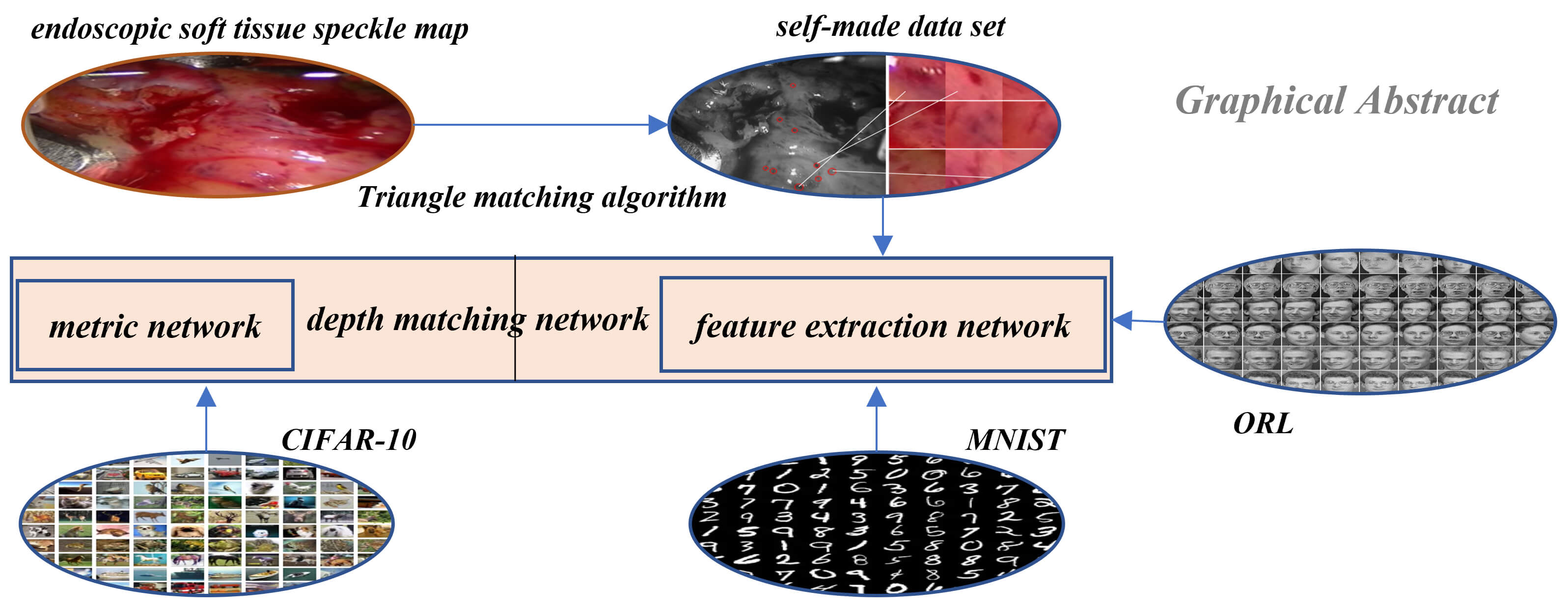 Research in the field of medical image is an important part of the medical robot to operate human organs. A medical robot is the intersection of multi-disciplinary research fields, in which medical image is an important direction and has achieved fruitful results. In this paper, a method of soft tissue surface feature tracking based on a depth matching network is proposed. This method is described based on the triangular matching algorithm. First, we construct a self-made sample set for training the depth matching network from the first N frames of speckle matching data obtained by the triangle matching algorithm. The depth matching network is pre-trained on the ORL face data set and then trained on the self-made training set. After the training, the speckle matching is carried out in the subsequent frames to obtain the speckle matching matrix between the subsequent frames and the first frame. From this matrix, the inter-frame feature matching results can be obtained. In this way, the inter-frame speckle tracking is completed. On this basis, the results of this method are compared with the matching results based on the convolutional neural network. The experimental results show that the proposed method has higher matching accuracy. In particular, the accuracy of the MNIST handwritten data set has reached more than 90%.Graphic Abstract
