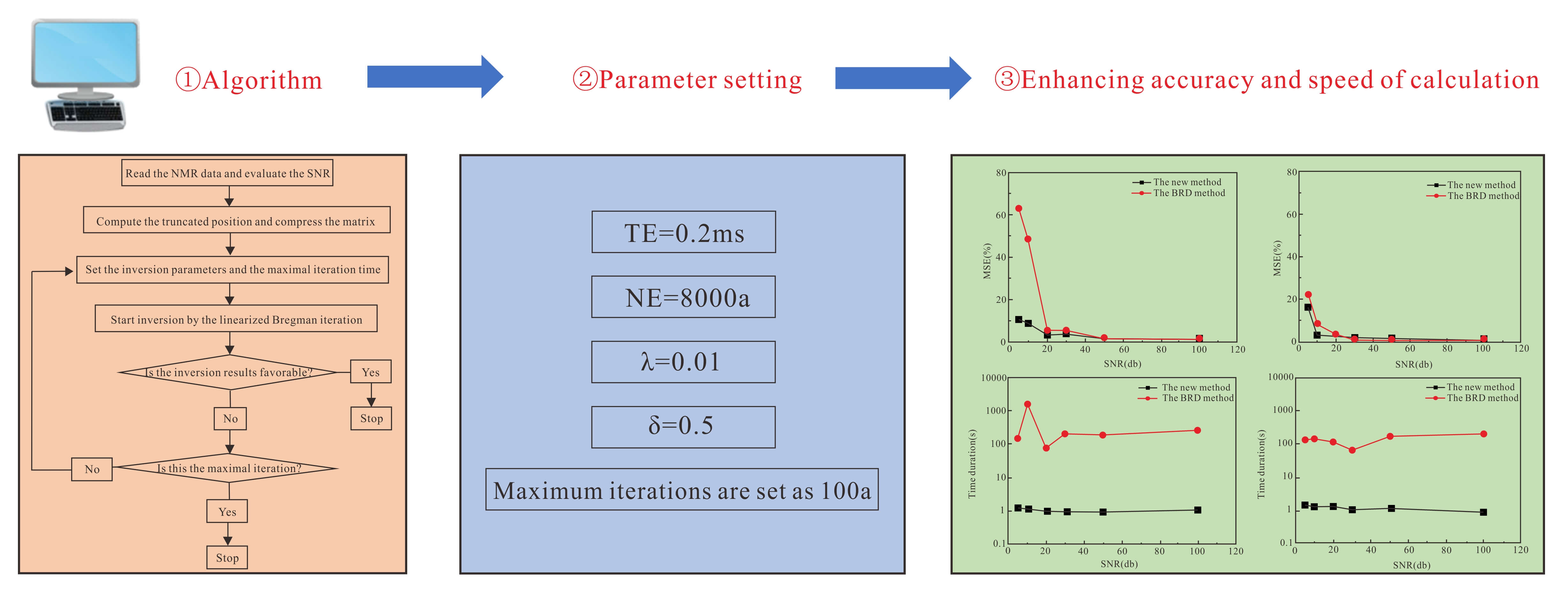 The low-field nuclear magnetic resonance (NMR) technique has been used to probe the pore size distribution and the fluid composition in geophysical prospecting and related fields. However, the speed and accuracy of the existing numerical inversion methods are still challenging due to the ill-posed nature of the first kind Fredholm integral equation and the contamination of the noises. This paper proposes a novel inversion algorithm to accelerate the convergence and enhance the precision using empirical truncated singular value decompositions (TSVD) and the linearized Bregman iteration. The L1 penalty term is applied to construct the objective function, and then the linearized Bregman iteration is utilized to obtain fast convergence. To reduce the complexity of the computation, empirical TSVD is proposed to compress the kernel matrix and determine the appropriate truncated position. This novel inversion method is validated using numerical simulations. The results indicate that the proposed novel method is significantly efficient and can achieve quick and effective data solutions with low signal-to-noise ratios.Graphic Abstract