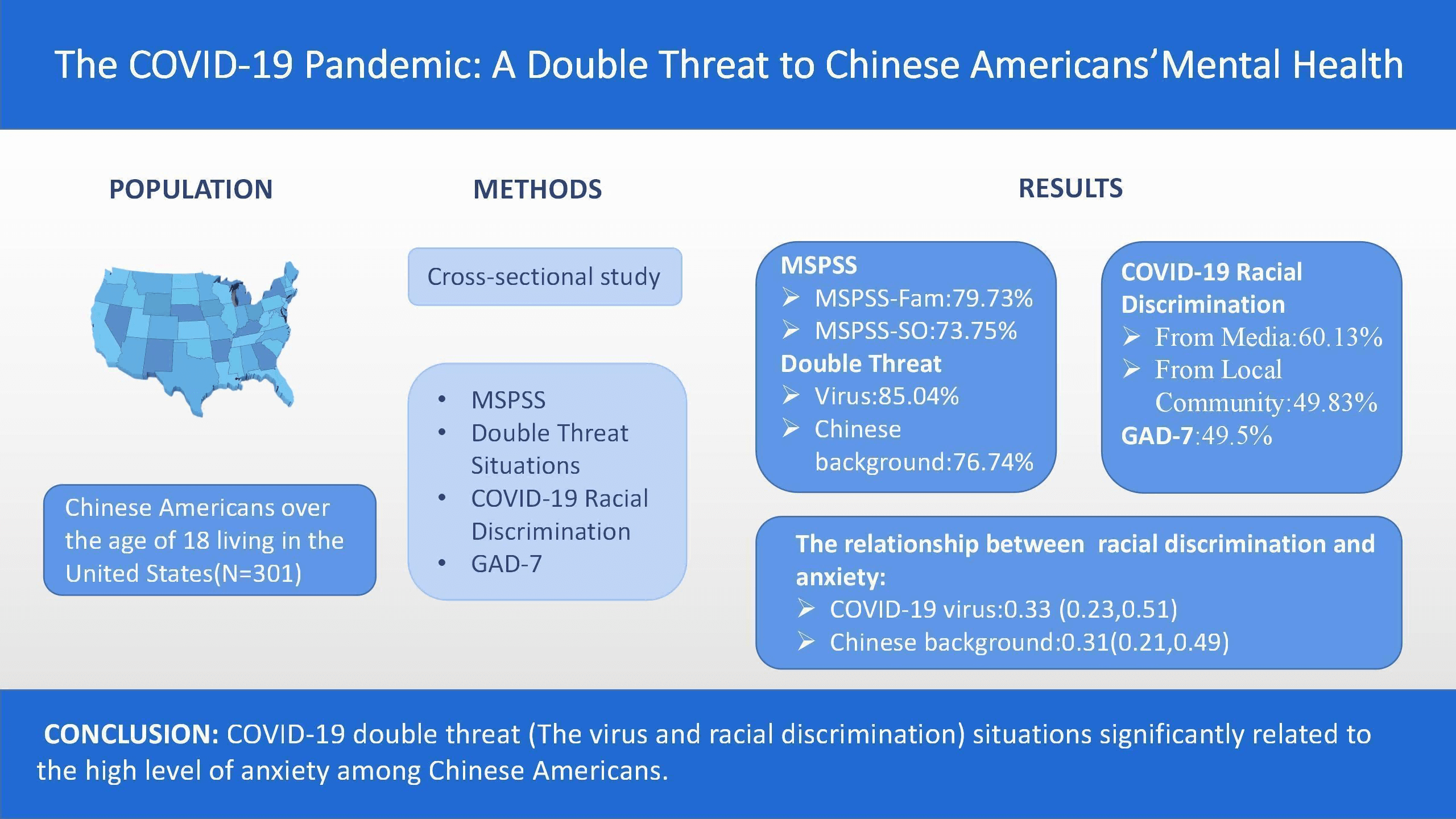 Objective: To explore the double psychosocial threats of the COVID-19 pandemic, targeted behavior toward Chinese Americans, and the correlates to their mental health. Methods: A quantitative, cross-sectional, and descriptive design was utilized by using a purposive convenience sample of 301 Chinese Americans over the age of 18 residing in the United States. Online data collection was conducted through the social media platform WeChat from April 8–21, 2021. Descriptive statistical analysis was used for the participants’ demographic characteristics, Multidimensional Scale of Perceived Social Support (MSPSS), Double Threat Situations, COVID-19 Racial Discrimination, and General Anxiety Disorder-7 (GAD-7). Stepwise logistic regression was conducted to verify predictors for anxiety levels by GAD-7. Results: In this sample (N = 301), 127 (42.19%) were male and 174 (57.81%) were female. The average age was 41.67 (SD = 5.89). Among MSPSS subscales, social support from family (MSPSS-Fam, 79.73%, n = 240) and social support from significant others (MSPSS-SO, 73.75%, n = 222) were high. 231 (76.74%) reported threats due to their Chinese ethnic background during the COVID-19 outbreak. Predictors for the high anxiety level by GAD-7 were COVID-19 racial discrimination from the local community (OR = 0.47, 95% CI = 0.39–0.71, p < 0.001), media/online (OR = 0.36, 95% CI = 0.26–0.53, p < 0.001), the perceived threat from the COVID-19 virus (OR = 0.33, 95% CI = 0.23–0.51, p < 0.001) and Perceived racism threat from Chinese background related to COVID-19 (OR = 0.31, 95% CI = 0.21–0.49, p < 0.001). Conclusions: COVID-19 double-threats (The virus and racial discrimination) situations are significantly related to the high level of anxiety among Chinese Americans. The sense of belonging and social perceptions of Chinese immigrants is closely related to public health problems in Western societies and needs to be addressed at all levels. Our findings call for the attention of healthcare workers to specific racism double-threatened situations and high mental health risks, as well as direct and indirect ethnic discrimination that Chinese Americans are experiencing during this pandemic, the long-term influences and effective coping ways related to this issue should be explored in further research.Graphic Abstract