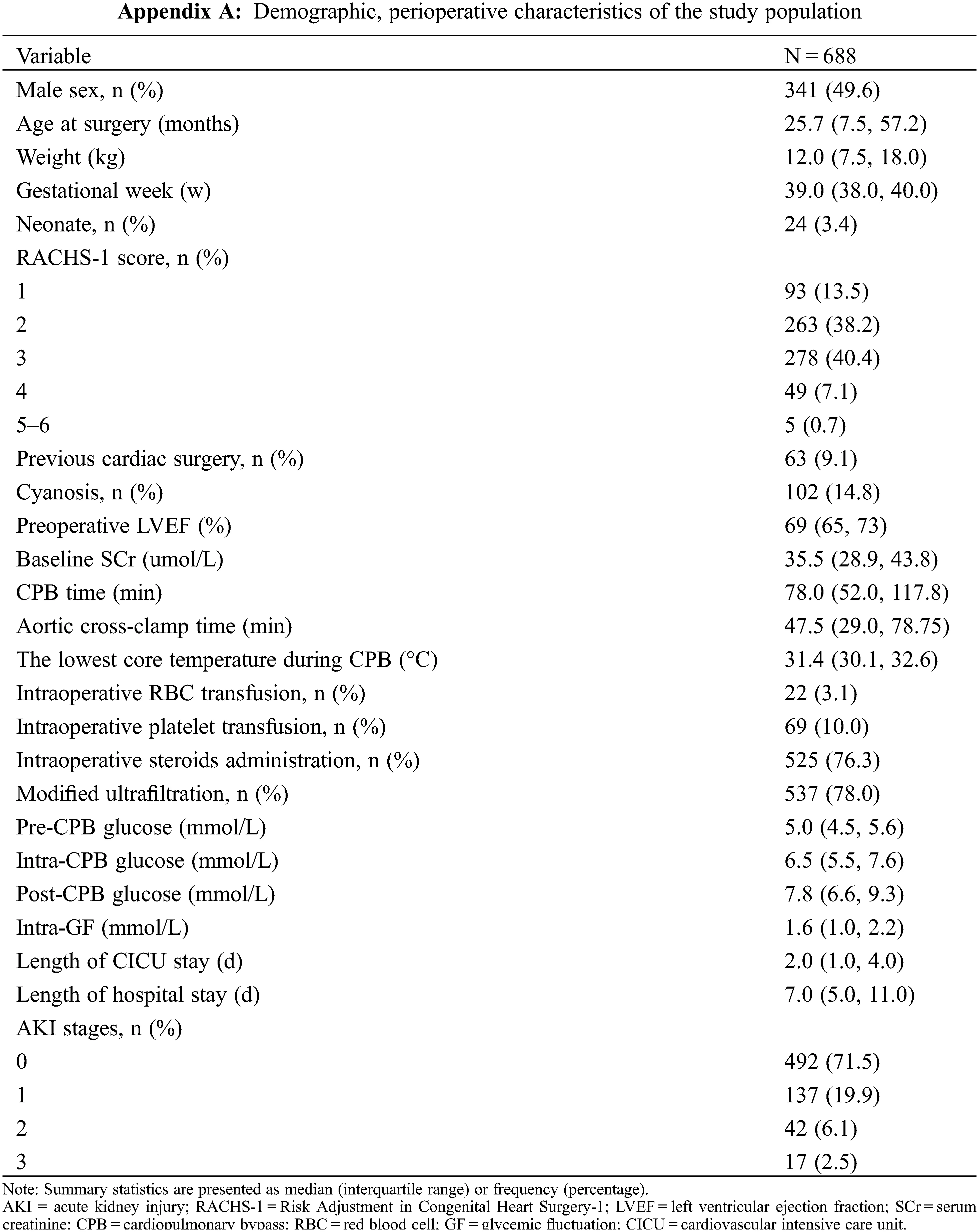 The general characteristics of eligible patients included age, sex, weight, gestation weeks, baseline SCr, preoperative left ventricular ejection fraction (LVEF), and cardiac surgery history [15]. Surgical complexity was assessed using the Risk Adjustment in Congenital Heart Surgery (RACHS)-1 score [16]. The history of diabetes and chronic kidney disease were validated from clinician-entered data in the preoperative evaluation form. We also recorded intraoperative medical data, such as CPB time, aortic cross-clamping time, the lowest core temperature during CPB, modified ultrafiltration, blood products transfusion, intraoperative steroids administration, and blood glucose values. Postoperative SCr was tested daily during the first 7 postoperative days. Besides, we also recorded the length of cardiac intensive care unit (CICU) and hospital stay.