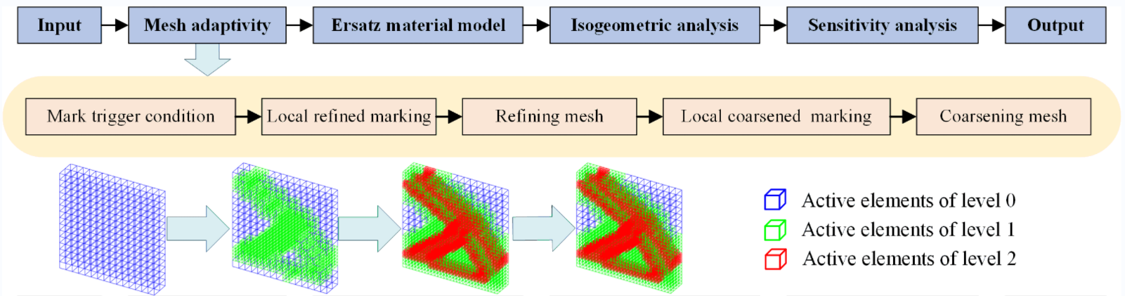 This work puts forward an explicit isogeometric topology optimization (ITO) method using moving morphable components (MMC), which takes the suitably graded truncated hierarchical B-Spline based isogeometric analysis as the solver of physical unknown (SGTHB-ITO-MMC). By applying properly basis graded constraints to the hierarchical mesh of truncated hierarchical B-splines (THB), the convergence and robustness of the SGTHB-ITOMMC are simultaneously improved and the tiny holes occurred in optimized structure are eliminated, due to the improved accuracy around the explicit structural boundaries. Moreover, an efficient computational method is developed for the topological description functions (TDF) of MMC under the admissible hierarchical mesh, which consists of reducing the dimensionality strategy for design space and the locally computing strategy for hierarchical mesh. We apply the above SGTHB-ITO-MMC with improved efficiency to a series of 2D and 3D compliance design problems. The numerical results show that the proposed SGTHB-ITO-MMC method outperforms the traditional THB-ITO-MMC method in terms of convergence rate and efficiency. Therefore, the proposed SGTHB-ITO-MMC is an effective way of solving topology optimization (TO) problems.Graphic Abstract