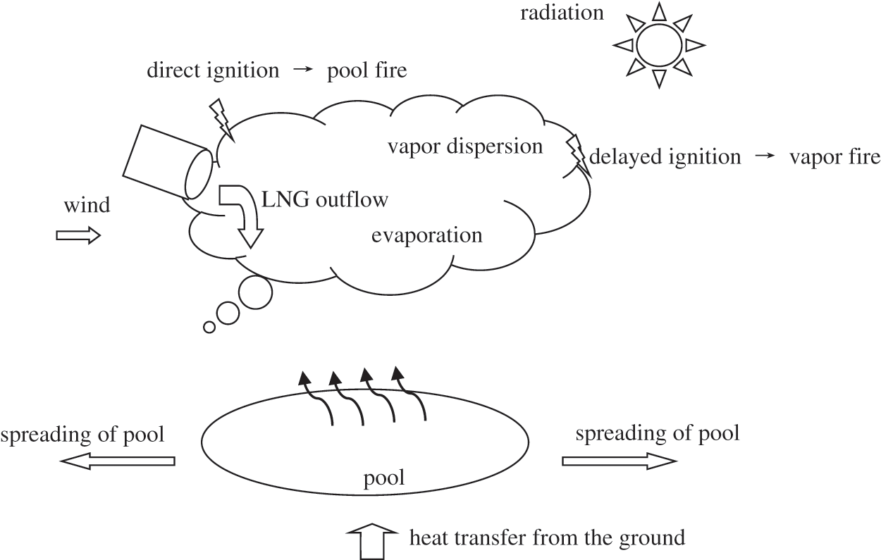 The potential hazards associated with LNG are varied. In the event of leakage, hazards may occur, including cryogenic tissue damage, pool fire, deflagrations, detonations and vapor cloud fires [8]. Due to its extremely cold temperature, materials may become embrittlement by direct contact. When LNG comes in contact with ground surface, cryogenic liquid boils off vigorously in response to the significant difference between the ground temperature and boiling point (boiling point of LNG is −162°C) [9]. Since LNG vapor disperse in the air, there are also thermal hazards form different combustion events such as vapor cloud fire or explosion. Therefore, it is necessary to conduct safety evaluation and analysis of LNG leakage hazards. Before this, it is necessary to understand the whole process of ground LNG leakage, as shown in Fig. 1.