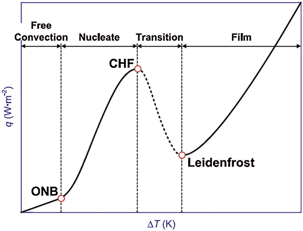 Figure 2: Typical boiling heat transfer curve (ONB—Onset of Nucleate Boiling; CHF—Critical Heat Flux)
