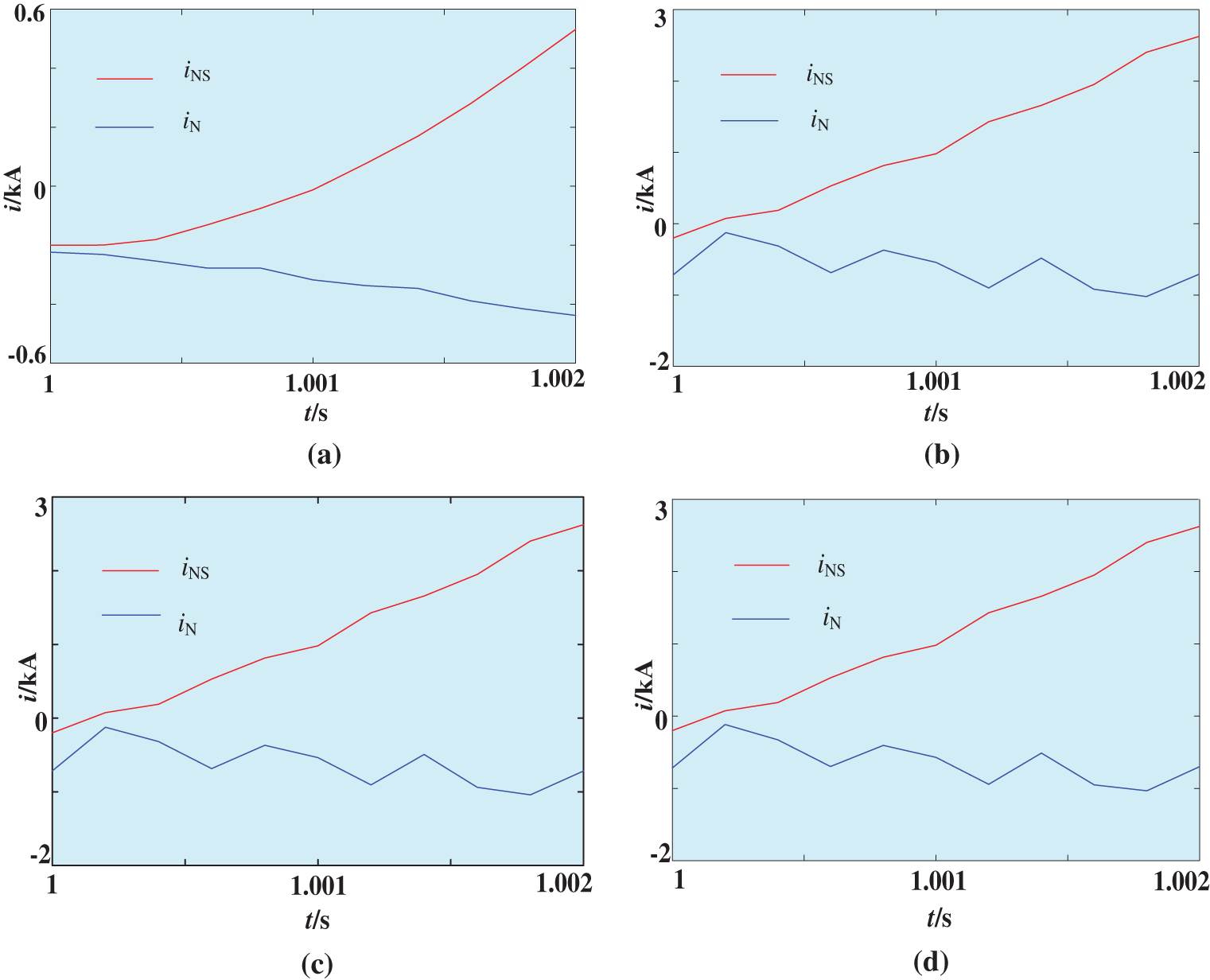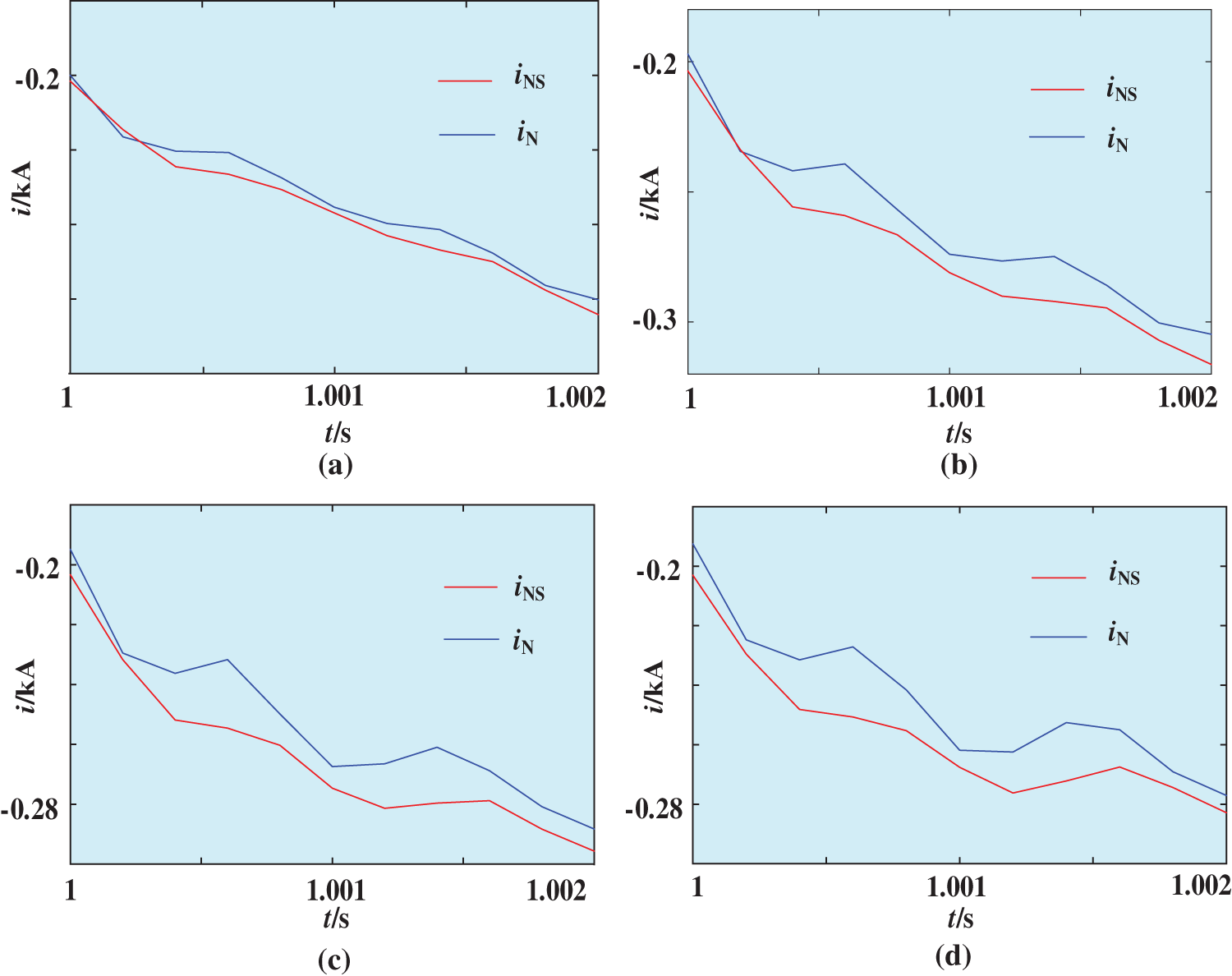 Figure 10: The relationship between iN and iNS under different transition resistances of an external fault. (a) 20 Ω, (b) 50 Ω, (c) 80 Ω, (d) 120 Ω