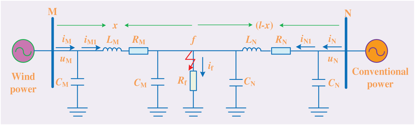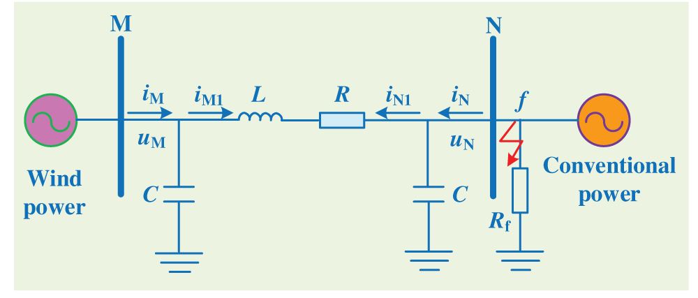 In Fig. 2, the left side is wind power supply, and the right side is conventional power supply. Rf is transition resistance. uM and uN are measured voltage, iM and iN are measured current at protection installation. iM1 and iN1 are current flowing through resistance and inductance parameters of the transmission line respectively. R and L are resistance and inductance, respectively. C is capacitance to ground of the transmission line.