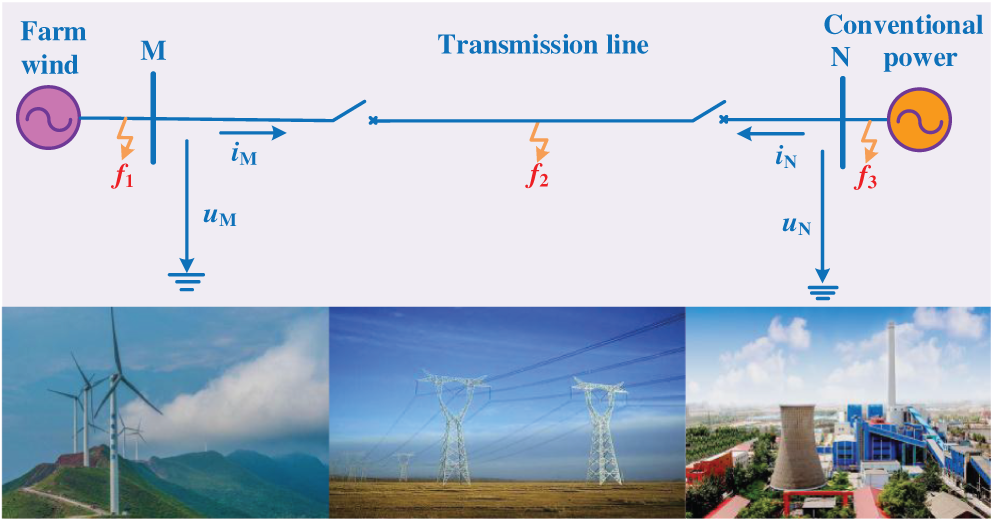 In Fig. 4, wind power is connected to a 40 MW wind farm composed of 20 DFIGs, and is connected to conventional power supply through the 110 kV transmission lines. uM, uN, iM, and iN is voltage and current measured at protection installation, respectively. Internal resistance of system power supply is 2 Ω; positive sequence impedance of the transmission lines is (0.034 + j0.415) Ω/km; positive sequence and zero-sequence capacitance is 0.0086 μF/km and 0.0061 μF/km respectively. Zero-sequence impedance is (0.253 + j0.873) Ω/km; length of the transmission lines is 60 km. The rated capacity of main transformer is 150 MVA; the rated voltage is 38.5 kV/110 kV; and voltage percentage is Uk% = 10.5. The rated capacity of box transformer for DFIG is 2.5 MVA; rated voltage is 0.69 kV/38.5 kV. The voltage percentage is Uk% = 6.5. The rated capacity of a single DFIG is 2 MW; rated voltage is 0.69 kV; stator impedance is (0.006813 + j0.1528) pu; rotor impedance is (0.007642 + j0.1359) pu; excitation reactance is 4.0152 pu; and moment of inertia is 3.5 s. The transformer is considered as ideal in the proposed method. Fault location is f1, f2, and f3 respectably. f1 is located outside wind power; f2 is located at transmission line; f3 is located outside conventional power.