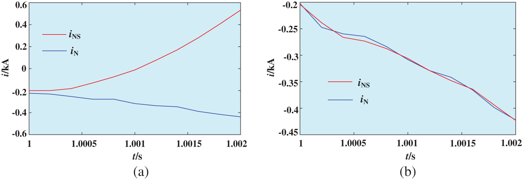 So current flowing through parameters of resistance and inductance does not conform to characteristics of equal magnitude and opposite direction, which is iM1+iN1 ≠ 0. Therefore, Eq. (13) does not hold, and the current measured by terminal-N does not conform to calculated current iN in Eq. (13) under an internal fault.