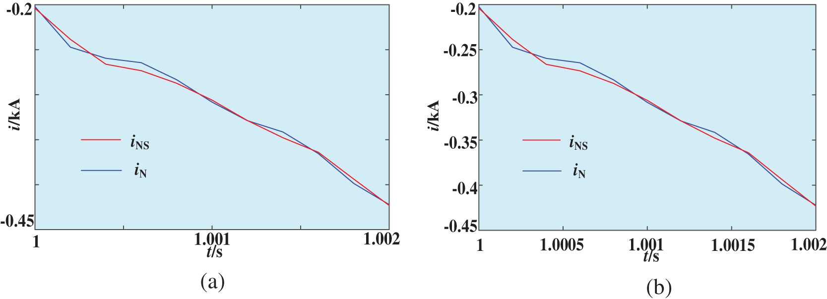 A single-phase ground fault occurs at f3 and f5 in Fig. 4. The transition resistance is 0.1 Ω; fault start time is 1 s; fault duration is 0.2 s; fault data is acquired in 2 ms data window; sampling frequency is 20 kHz. The relationship between iN and iNS is shown in Fig. 5. In Fig. 5, iN represents calculated current, and iNS represents measured current, as does the meaning of iN and iNS that appear in the simulation below.
