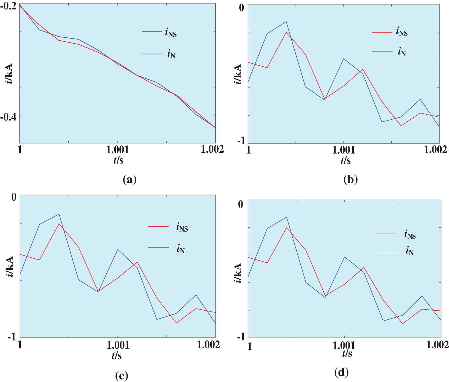In Fig. 5, when a fault occurs outside system side, the similarity of iN and iNS is quite high. When an internal fault occurs, the similarity of iN and iNS is quite low. H(iN, iNS) under an external fault is 0.0089, which is close to 0. H(iN, iNS) under an internal fault is 0.7648, which is greater than set value. Therefore, the calculated current can be matched with measured current, and internal and external faults can be identified according to similarity. A longer sampling time window will be required at the higher sampling frequency by this method. The proposed method only needs to extract the first few sampling points of the fault signal, so the sampling frequency is lower. And a sampling device with the stronger processing capabilities will be required at the higher sampling frequency. The sampling frequency of actual sampling device on site is usually within 20 kHz. Therefore, the sampling frequency of the method proposed in this article is suitable for field operation.