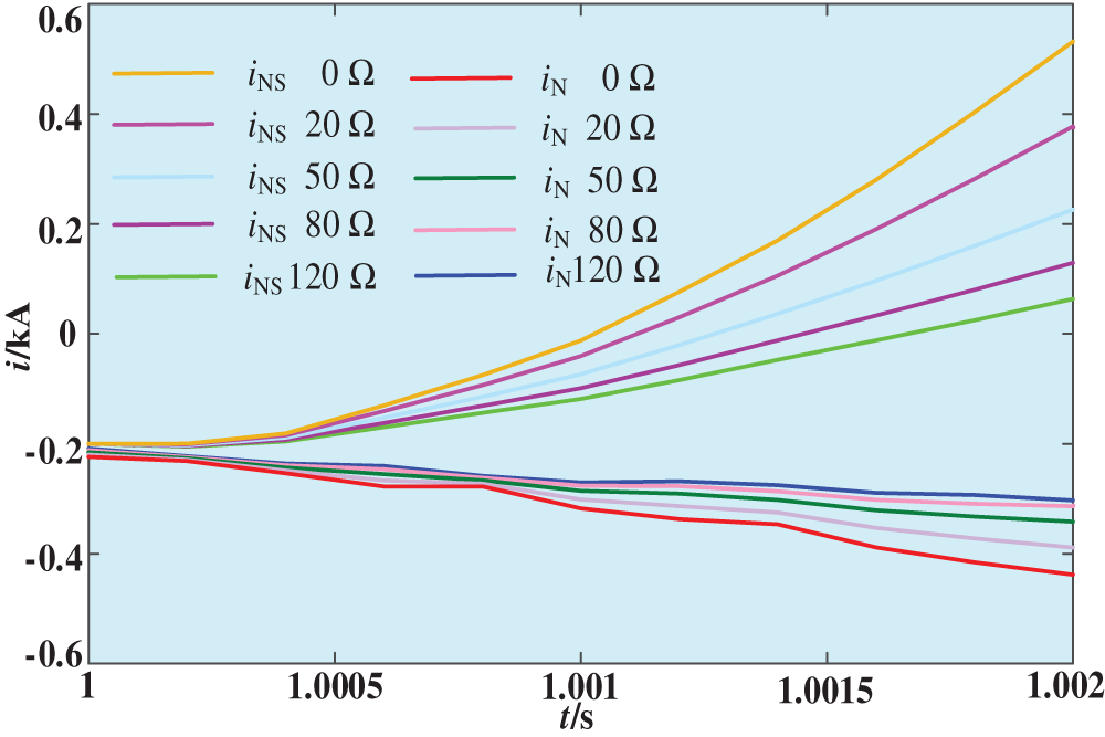In Tab. 3, H(iN, iNS) is greater than 0.2 under an internal fault, and H(iN, iNS) is less than 0.2 under an external fault, which can be correctly distinguish internal and external faults. In this protection method, the waveform characteristics of calculated current depend on waveform characteristics of voltage and current measured on both sides. It does not directly depend on magnitude of short-circuit current, so H(iN, iNS) can also meet requirements of criterion under different transition resistances.