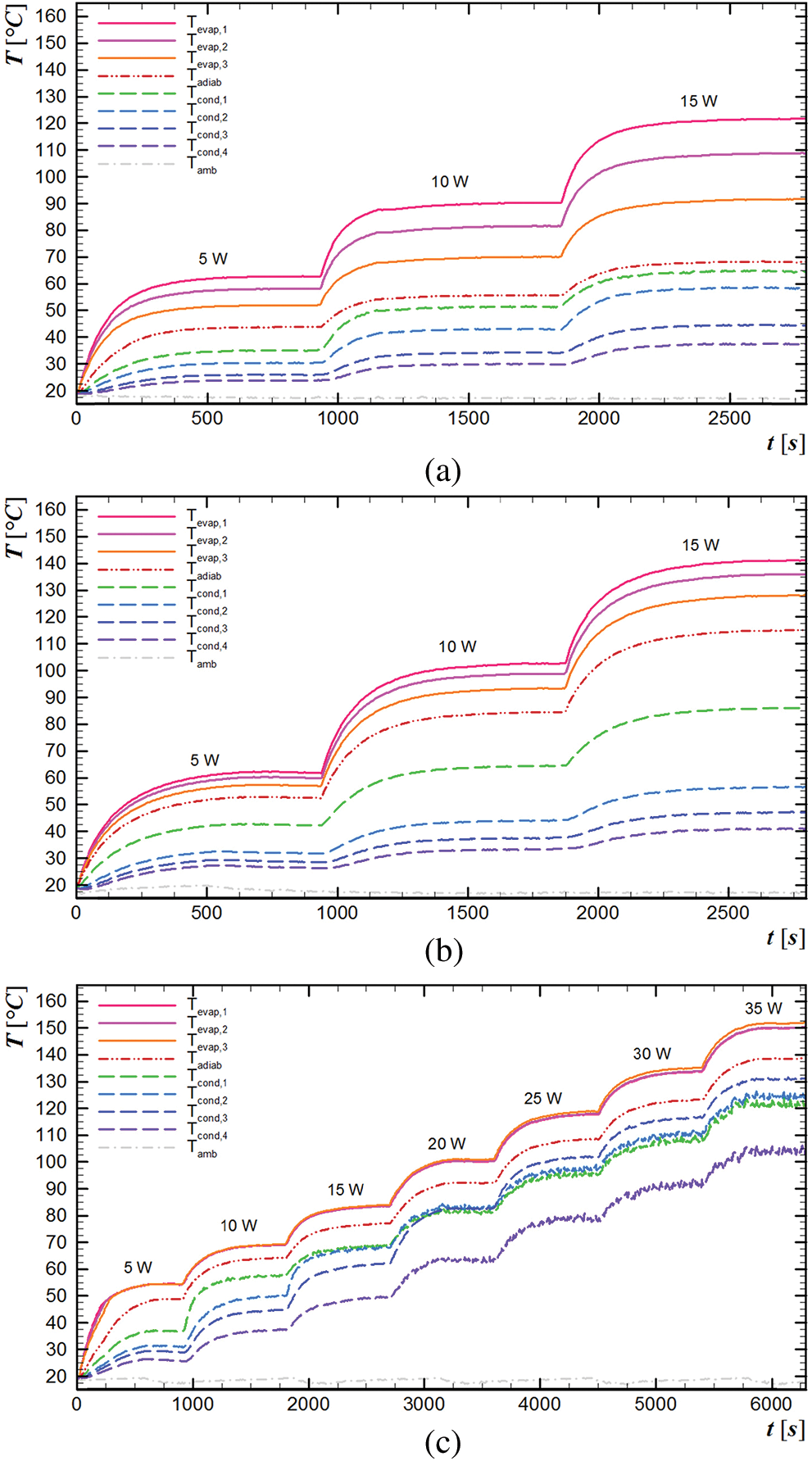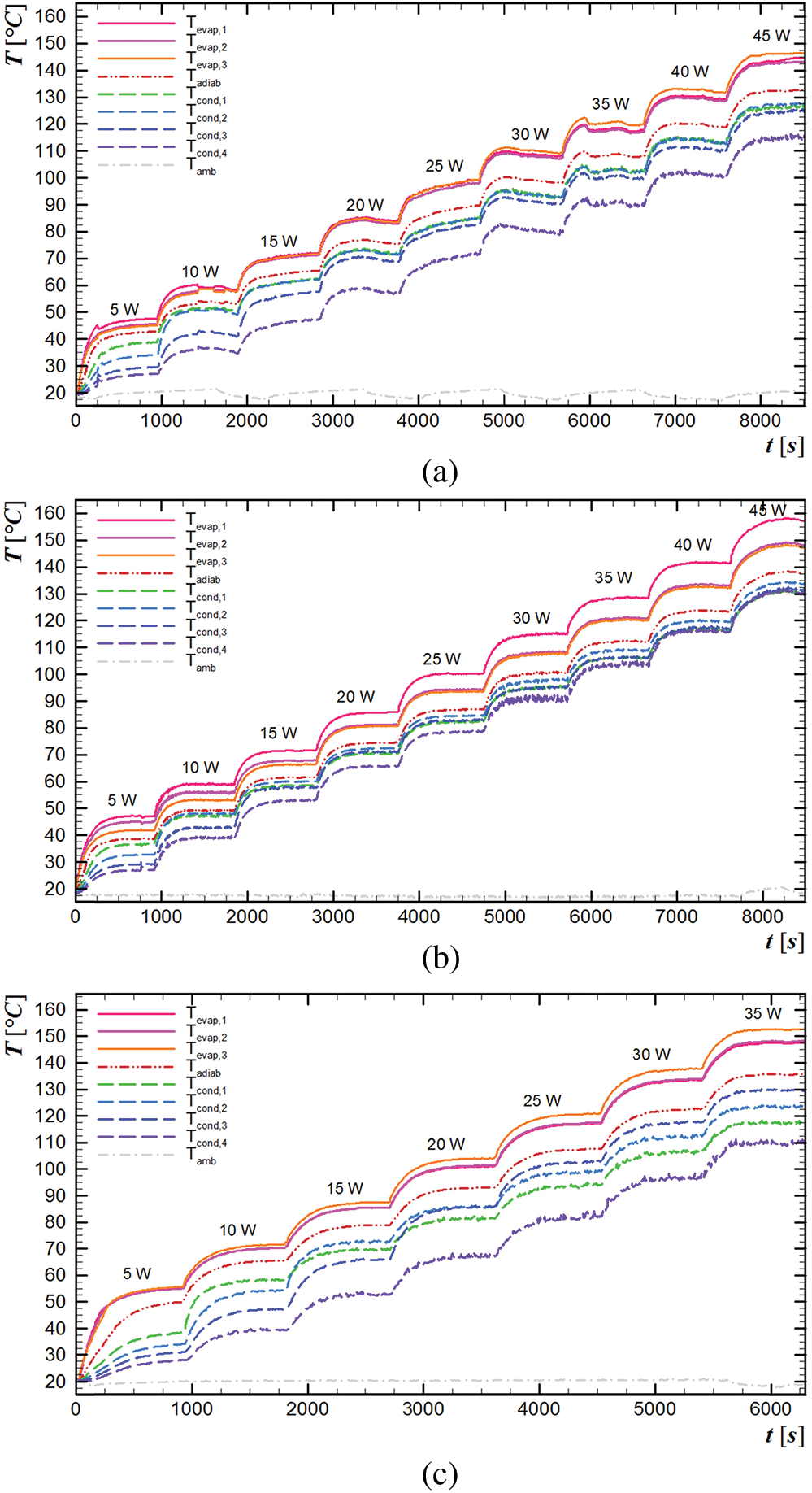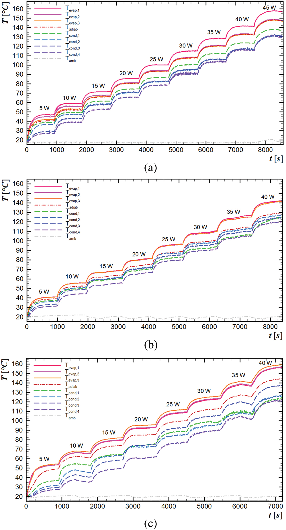 The thermal load starts with 5 W, which stays approximately 15 minutes when the thermocouples present stationary values. So, the power receives an increment of 5 W. Critical temperature determines the maximum power that can be dissipated through heat pipe. For this study, the highest temperature is 150°C, which can promote the materials melting. The thermocouple data is obtained every five seconds and recorded by software Agilent™ Benchlink Data Logger 3.