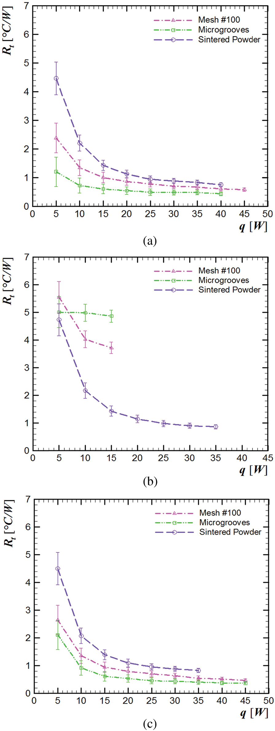One of the most important criteria for choosing each capillary structure is the heat transfer capability of them. It is noteworthy that the capillary properties and the heat transfer capabilities of heat pipes depend not only on the type of capillary structure but also on their characteristics. For a screen mesh, the number of layers and cell size must be accounted for; for microgrooves the profile, depth and pitch of grooves are essential elements; while for sintered metal powder the particle size, layer thickness, and porosity are influencing factors. In this context, for the comparison of different capillary structures in this work, previous experimental studies provided the best parameters for the better thermal performance of each wick. The researches were [38–40] for screen mesh, microgrooves, and sintered powder, respectively.