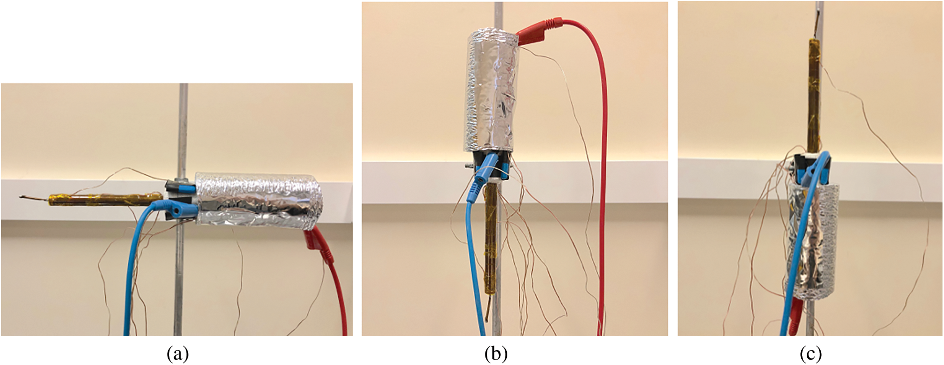 An air-conditioning system Carrier™ maintains the room temperature at 19°C ± 1°C and, in this way, guaranteeing the experimental repeatability. The tests were done in three different operation positions: 0°, 90° (evaporator above condenser), and 270° (evaporator under condenser) referred to the horizontal. They were carefully fixed at the test positions by the adiabatic section with universal support in Fig. 7. Every test has a checklist to be done, which guarantees that the thermocouples, insulation, and resistor connection are rightly installed. The fan at 5.0 m/s is positioned on the cold side and the combined error is ± 0.2 m/s. Mean air velocity was calculated in accordance with the American Society of Heating, Refrigerating and Air-Conditioning Engineers (ASHRAE) Handbook [41]. The system that acquired data is switched on and verified if all the temperatures are almost the same as the room temperature. If yes, the desired power is dissipated to the resistor.