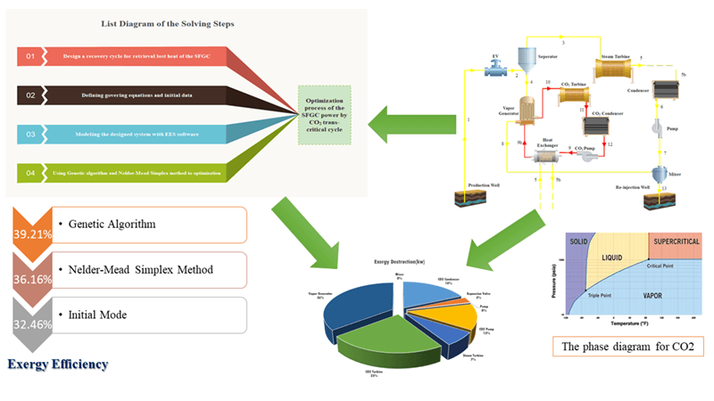 The usage of renewable energies, including geothermal energy, is expanding rapidly worldwide. The low efficiency of geothermal cycles has consistently highlighted the importance of recovering heat loss for these cycles. This paper proposes a combined power generation cycle (single flash geothermal cycle with trans-critical CO2 cycle) and simulates in the EES (Engineering Equation Solver) software. The results show that the design parameters of the proposed system are significantly improved compared to the BASIC single flash cycle. Then, the proposed approach is optimized using the genetic algorithm and the Nelder-Mead Simplex method. Separator pressure, steam turbine output pressure, and CO2 turbine inlet pressure are three assumed variable parameters, and exergy efficiency is the target parameter. In the default operating mode, the system exergy efficiency was 32%, increasing to 39% using the genetic algorithm and 37% using the Nelder-Mead method.Graphic Abstract