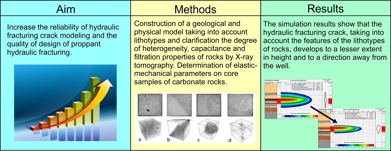 Survey and novel research data are used in the present study to classify/identify the lithological type of Verey age reservoirs’ rocks. It is shown how the use of X-ray tomography can clarify the degree of heterogeneity, porosity and permeability of these rocks. These data are then used to elaborate a model of hydraulic fracturing. The resulting software can take into account the properties of proppant and breakdown fluid, thermal reservoir conditions, oil properties, well design data and even the filtration and elastic-mechanical properties of the rocks. Calculations of hydraulic fracturing crack formation are carried out and the results are compared with the data on hydraulic fracturing crack at standard conditions. Significant differences in crack formation in standard and lithotype models are determined. It is shown that the average width of the crack development for the lithotype model is 2.3 times higher than that for the standard model. Moreover, the coverage of crack development in height for the lithotype model is almost 2 times less than that for the standard model. The estimated fracture half-length for the lithotype model is 13.3% less than that of for the standard model. A higher dimensionless fracture conductivity is also obtained for the lithotype model. It is concluded that the proposed approach can increase the reliability of hydraulic fracturing crack models.Graphic Abstract