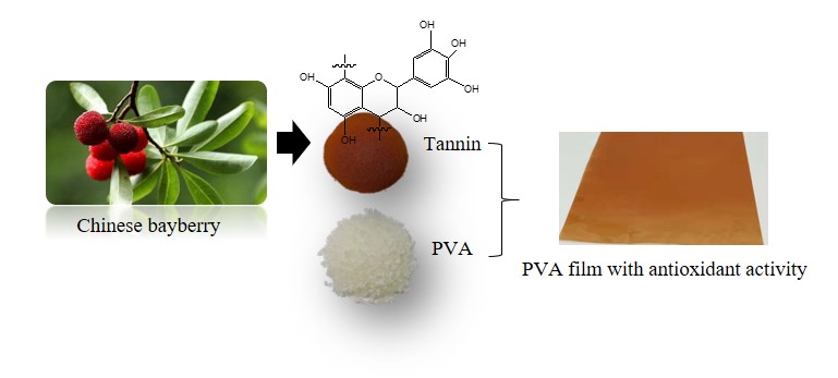 The current work explores the potential use of commercial Chinese bayberry tannin (BT) to develop antioxidant PVA-based films using solvent casting process for packaging applications. The effect of BT concentration on opacity, water resistance and antioxidant capacity of resulting films was investigated. Properties like tensile strength, thermal behavior, and morphological aspects were also characterized. The experimental results showed that PVA/BT films formed with uniformly brown color and generally good transparency, offering good antioxidant ability. The PVA film containing BT presented slightly higher water resistance according to the results of moisture content and water vapor permeability, especially at low BT content (<10 wt%). The PVA can be compounded with up to 10 wt% BT without any obvious deterioration in the tensile strength. The PVA/BT films exhibited better thermal degradation behavior compared with PVA alone because of the chemical bonds of PVA-BT and the formation of char at high temperature. Based on the results, PVA incorporated with Chinese bayberry tannin may provide broader formulation options for packaging materials with antioxidant action.Graphic Abstract