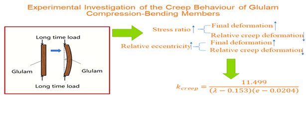 Creep test results of glulam members under compression and bending were studied in this paper. The creep tests were conducted to investigate the influence of the stress level and relative eccentricity on the creep deformation of glulam members. The test results showed that the creep deformation trends of glulam members under long-term compression and bending loading were similar; the creep deformation increased with increases in both the stress level and relative eccentricity. However, the relative creep deformation decreased with the increase in both the stress level and relative eccentricity under long-term loading, and a five-parameter creep model was proposed to analyse the creep mechanism of glulam members under compression and bending. The good fitness of the test results indicated that the five-parameter model was able to accurately simulate the creep deformation of glulam compression-bending members. Moreover, a numerical model was developed using the creep equation, which was related to the parameter and . The simulation results were in good agreement with the test results, and the parameters and were correlated to the relative eccentricity and stress level, respectively. Based on the corrected parameters and , the relative creep deformation of glulam compression-bending members was predicted over 50 years.Graphic Abstract