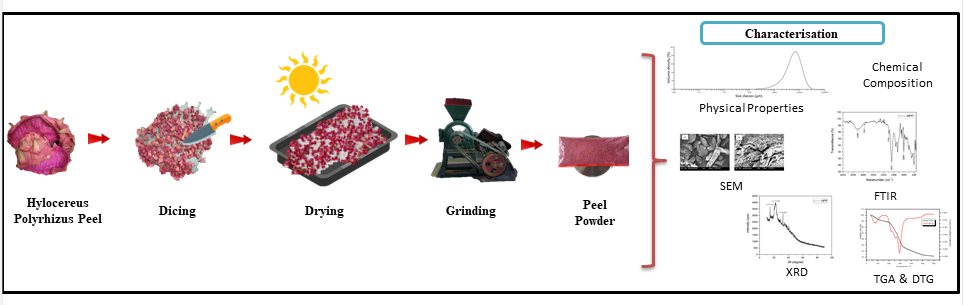 The strict environmental regulations to overcome the drawbacks of consumption and disposal of non-renewable synthetic materials have motivated this investigation. The physical, chemical, morphological, and thermal properties of Hylocereus Polyrhizus peel (HPP) powder obtained from the raw materials were examined in this study. The physical properties analyzes of Hylocereus Polyrhizus peel (HPP) powder discovered that the moisture content, density, and water holding capacity were 9.70%, 0.45 g/cm3 , and 98.60%, respectively. Meanwhile, the chemical composition analysis of Hylocereus Polyrhizus peel (HPP) powder revealed that the powder was significantly high in cellulose contents (34.35%) from other bio-peel wastes. The crystallinity index of Hylocereus Polyrhizus peel (HPP) powder was 32.76%, according to further X-ray diffraction (XRD) analysis. The thermal stability of Hylocereus Polyrhizus peel (HPP) powder was examined using thermogravimetric analysis (TGA) and found thermally stable at 204°C. The morphological study via scanning electron microscopy (SEM) showed a shriveled and irregular geometry surface. Hylocereus Polyrhizus peel (HPP) powder demonstrated the peak in the range representing the major functional groups responsible for pectin’s properties. Thus, the findings revealed that the Hylocereus Polyrhizus peel (HPP) powder has the potential for the development of biodegradable and renewable materials.Graphic Abstract