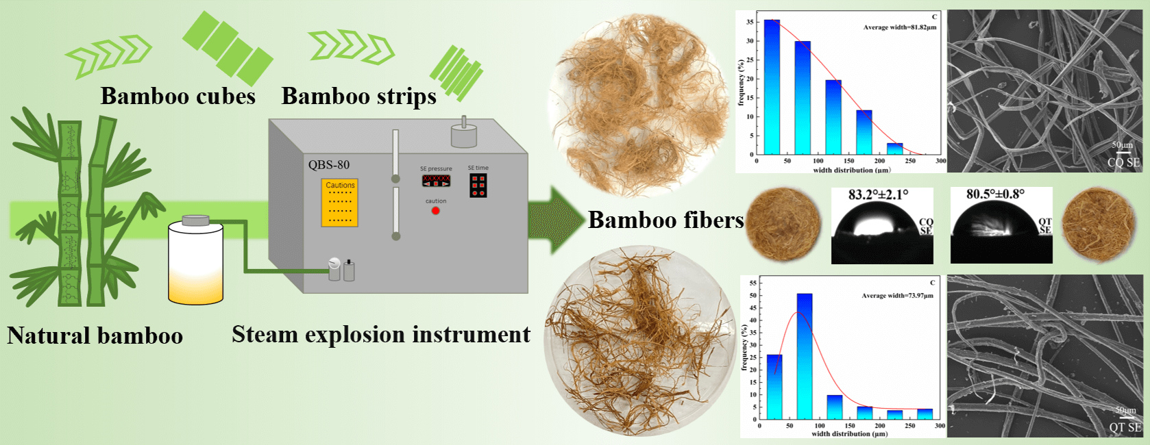 To overcome the shortage of wood resources as well as to develop novel natural fibers materials, the Chimonobambusa quadrangularis (CQ) and Qiongzhuea tumidinoda (QT) planted in Southwest China were effectively isolated by the steam explosion (SE). The fine and uniform bamboo microfibers derived from CQ and QT were obtained, and their smallest average widths were 12.62 μm and 16.05 μm, respectively. The effects of steam explosion on the micro-morphology, chemical composition, thermal stability, crystallinity, surface wettability, and mechanical properties of bamboo microfibers were comprehensively investigated. The results showed that the relative content of cellulose in bamboo microfibers increased but the hemicellulose and lignin contents decreased after SE. The degrees of crystallinity for CQ and QT increased from 40.49% and 39.46% to 68.90% and 55.78%, respectively. The thermal stability and surface hydrophilicity were also improved. The CQ microfibers had a maximum decomposition temperature of 2.79°C, a tensile strength of 58.54 MPa, an elongation at break of 0.6%, and a water contact angle of 2.7° higher than those of the QT microfibers.Graphic Abstract